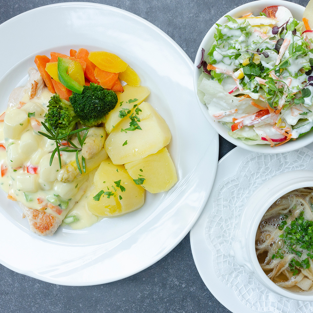 Täglich zwei frisch gekochte Hauptgerichte, eines davon vegetarisch, zur Auswahl! Gerne als Tagesteller oder als zweigängiges Menü mit Suppe oder Salat.